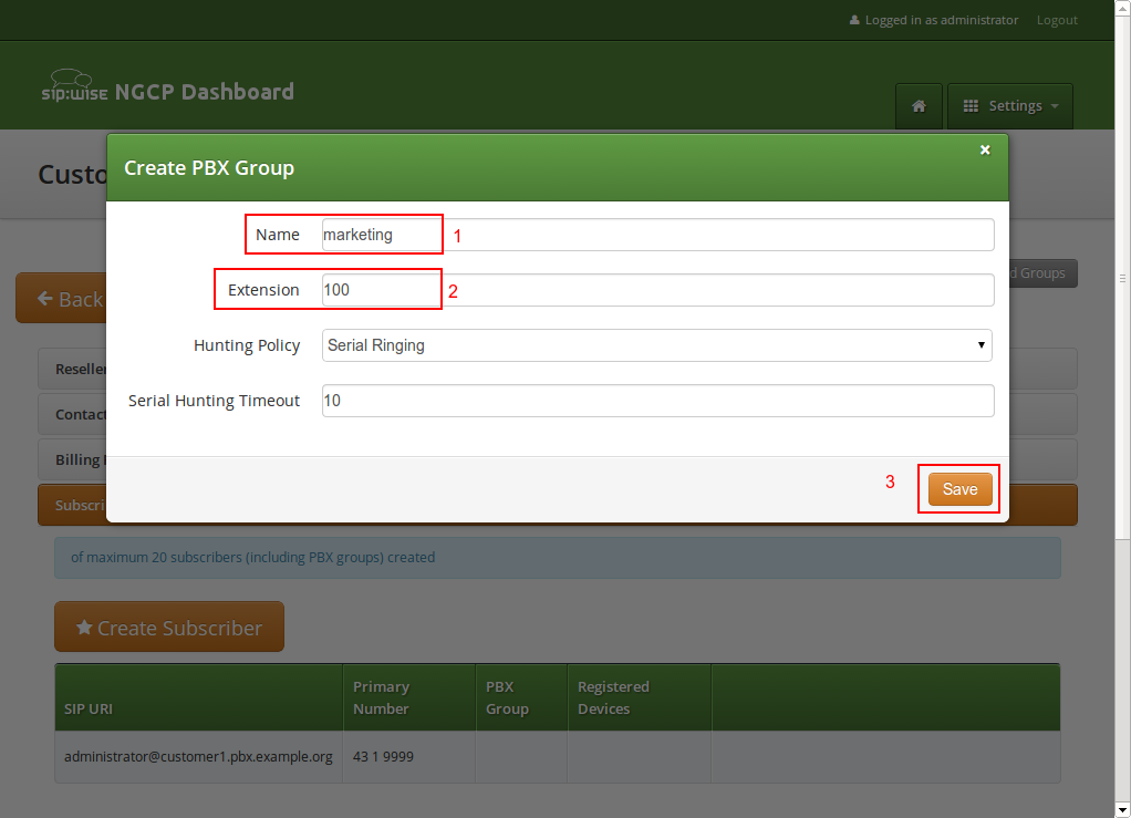 43 1 9999 and the extension is 100, you can reach the group from the outside by dialing 43 1 9999 100. Since PBX Groups are actually just normal subscribers in the system, you can assign Alias Numbers to it for DID later, e.g. 43 1 9998.