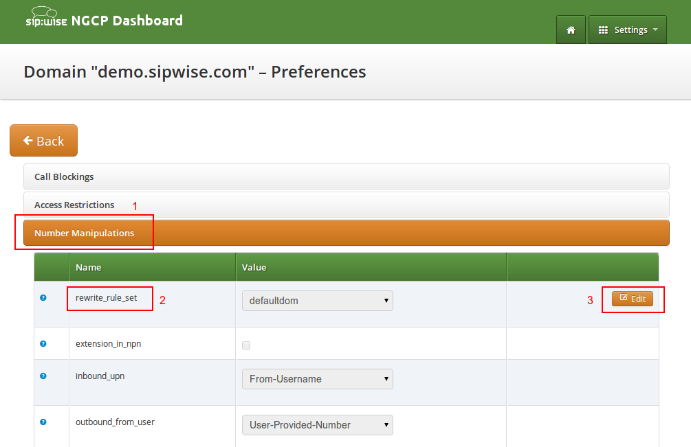 Once you have finished to define your Rewrite Rule Sets, you need to assign them. For sets to be used for subscribers, you can assign them to their corresponding domain, which then acts as default set for all subscribers. To do so, go to Settings→Domains and click Preferences on the domain you want the set to assign to. Click on Edit and select the Rewrite Rule Set created before.
