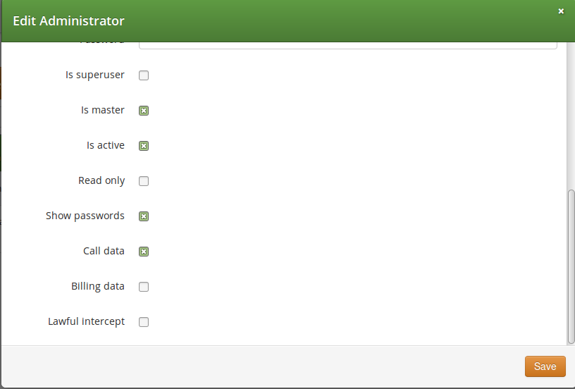 Configuration of access rights of system administrators is possible through the admin panel of NGCP. In order to do that, please navigate to Settings → Administrators.