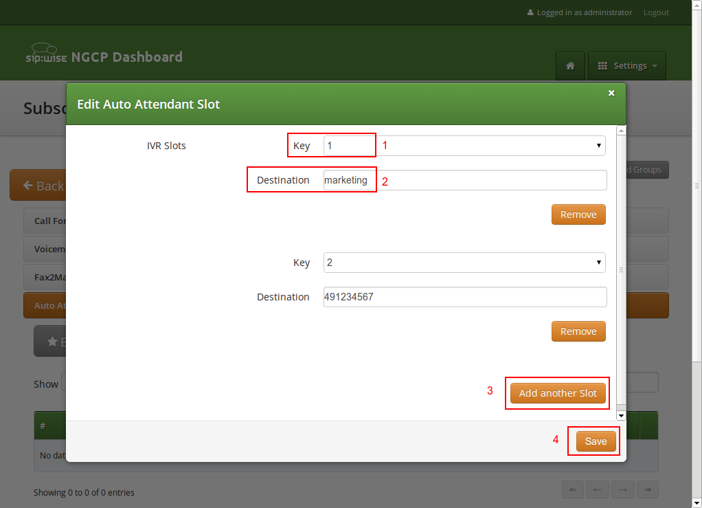 Once the subscriber is created, he can log into the customer self-care interface at https://<your-ip>/login/subscriber and manage his PBX, like creating other users and groups, assigning Devices to subscribers and configure the Auto Attendant and more.