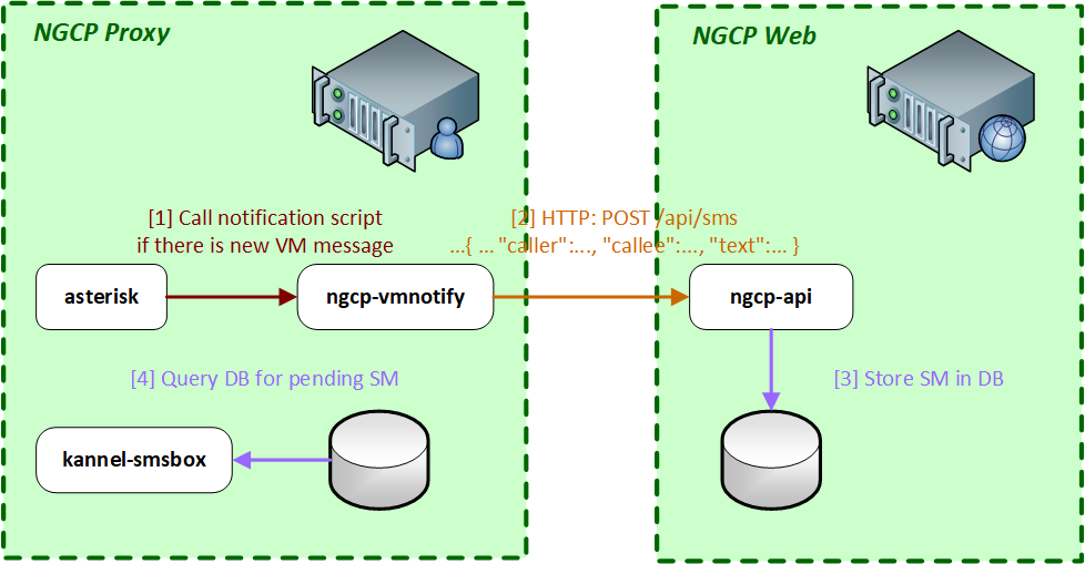 The Sipwise C5 also supports voicemail notifications in form of short messages, using the built-in SMS modules. In such a case the ngcp-vmnotify module will send an HTTP POST request to the REST API (Sipwise C5 Web), that will contain the short message and finally be stored in the central database. Afterwards the short message will be sent to the recipient by Sipwise C5 Proxy.