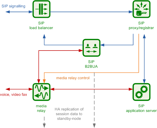 Once a load balancer sends a new message to a proxy, the SIP transaction and/or dialog gets anchored to this proxy. That way it is ensured that a call starting on a proxy is also ended on the same proxy. Hence, the full range of feature handling like media relay, voicemail, fax, billing and rating is performed on this proxy. So, there is no a central point for various tasks, potentially leading to a non-scalable bottleneck. Due to the anchoring, proxies come in pairs and replicate all internal state information to the standby node via redis. In case of fail-over, the full signalling and media are moved to the standby node without interruption.